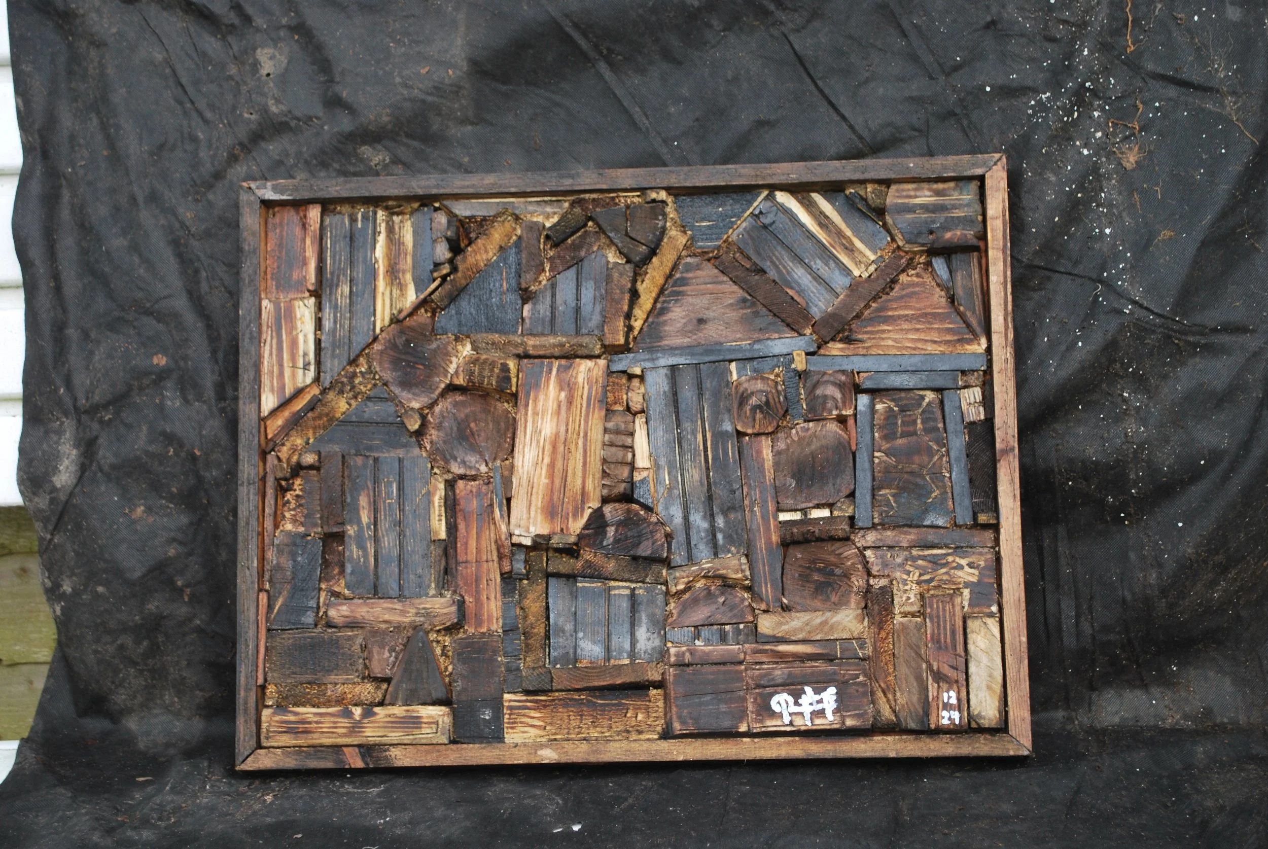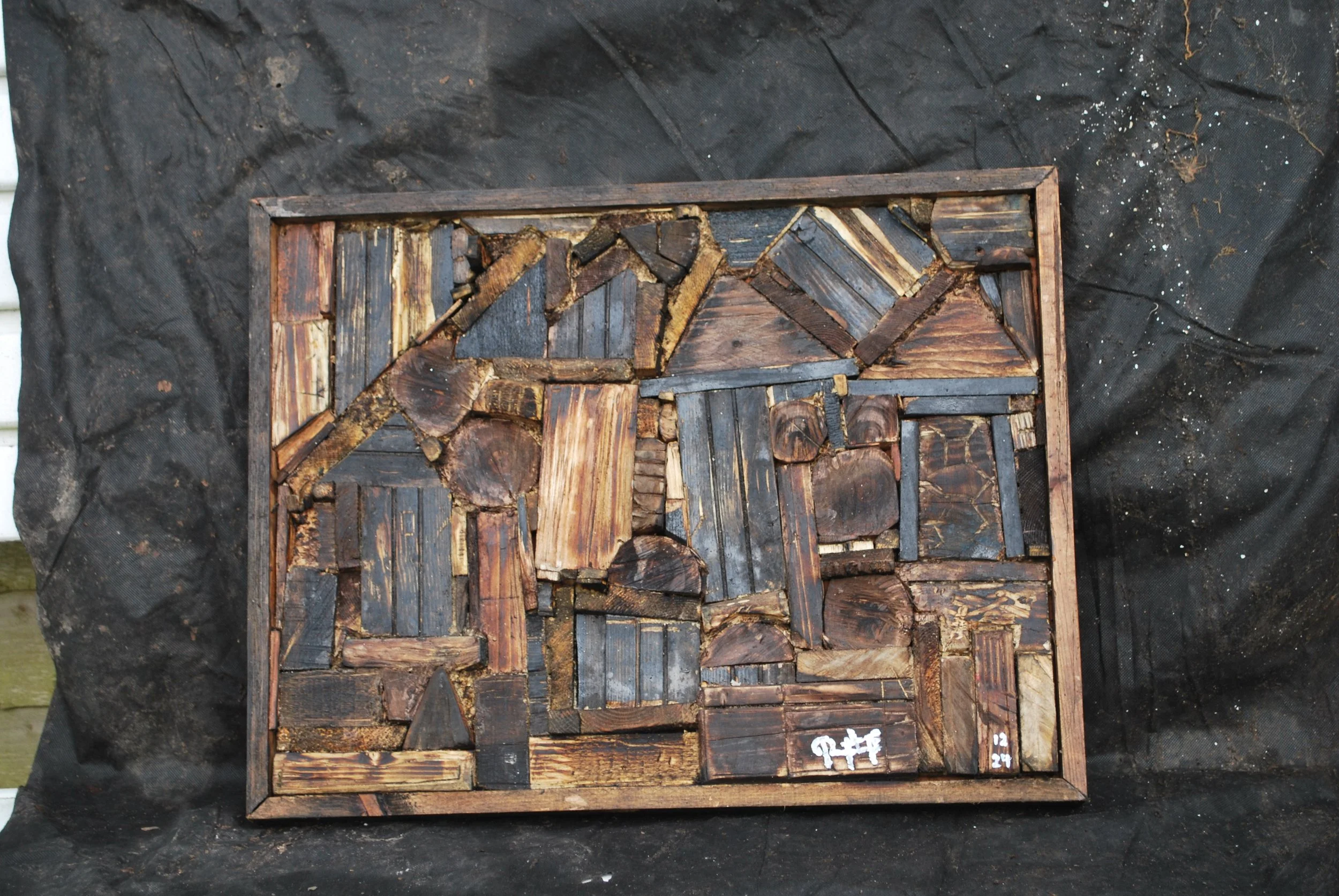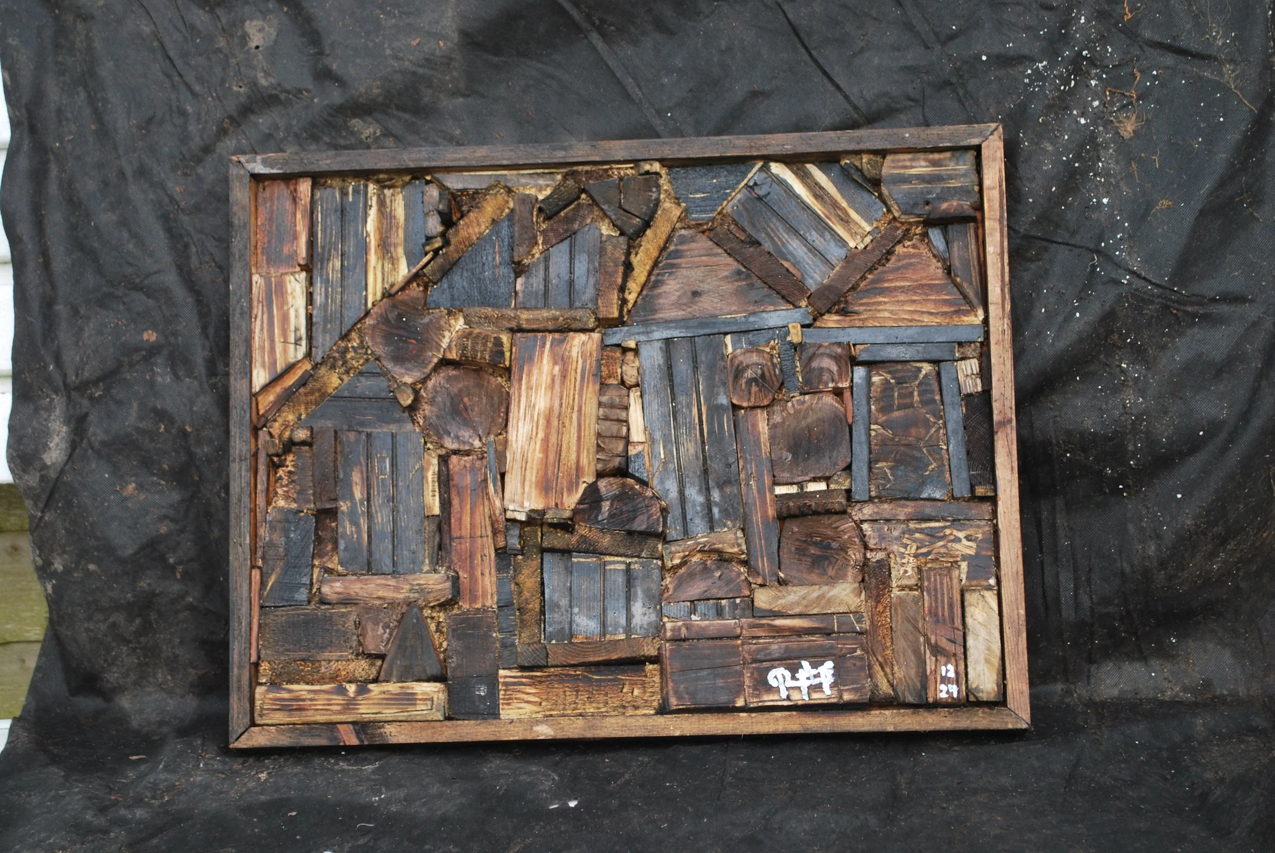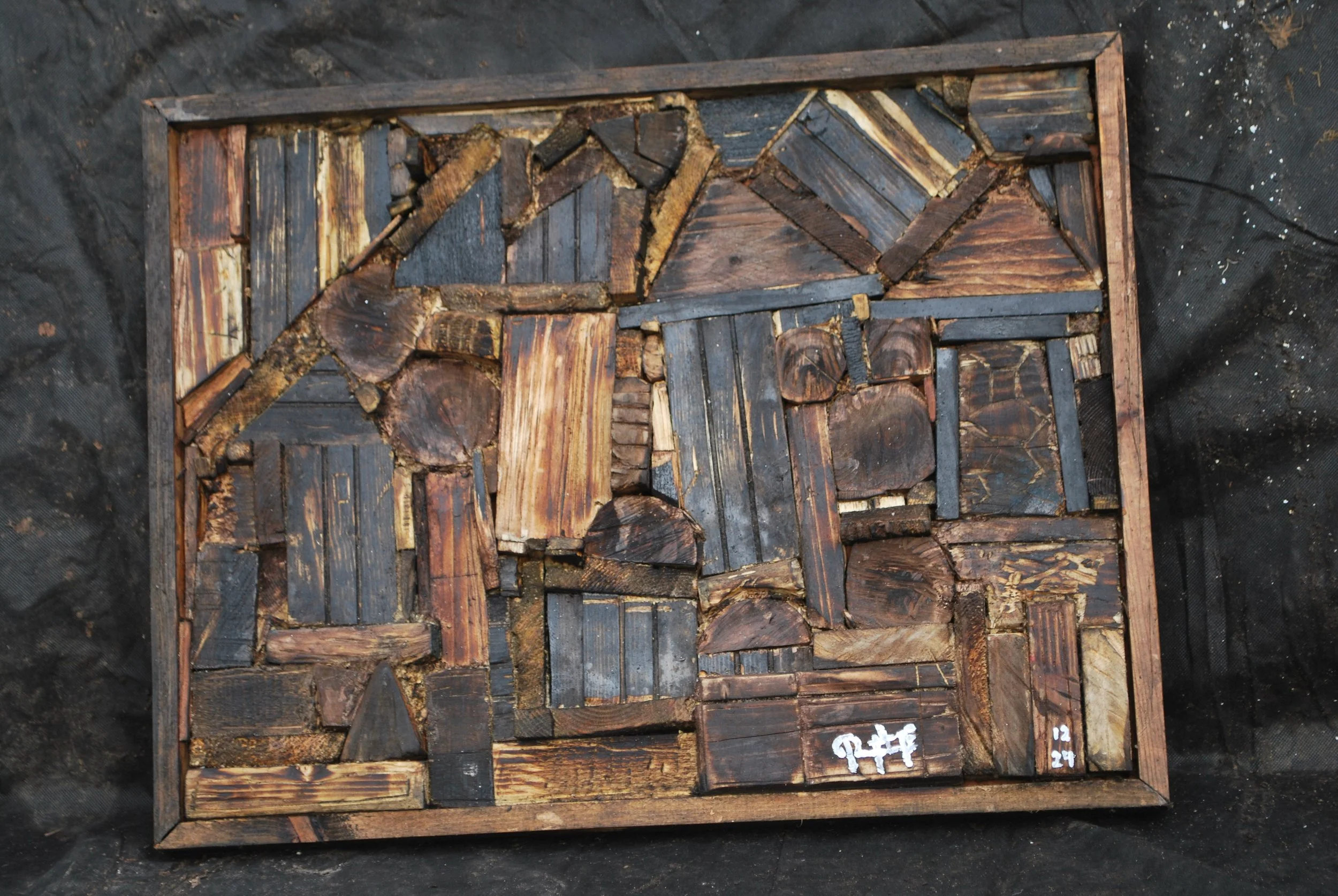 This work is inspired by nature, shapes such as triangles, rectangles. In our city we had many barns, which burned down as a result, this is a work that represents past events and feelings. The sculpture in the form of a painting is made of hundreds of individually carved pieces glued together . No power tools were used. I use found boards, trees, which I cut by hand, such as walnut, cherry, pine.